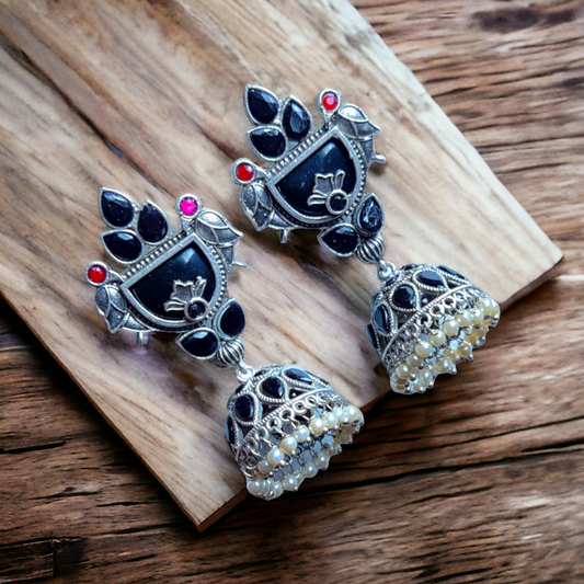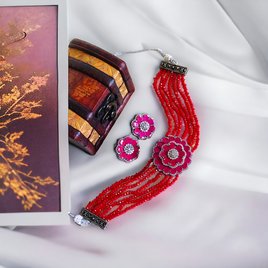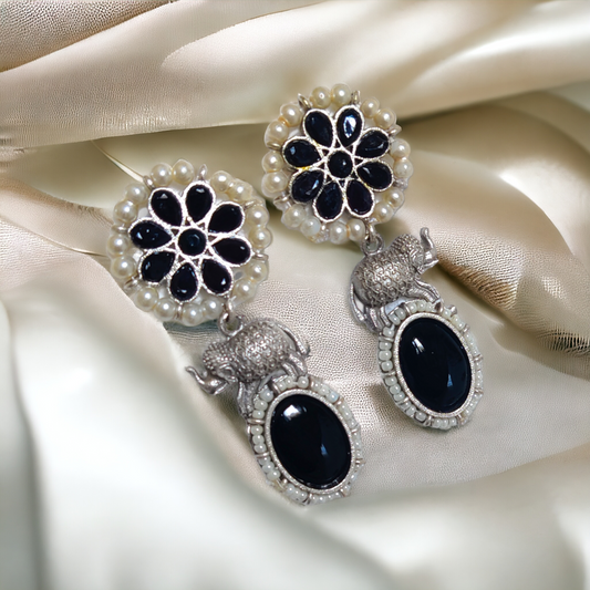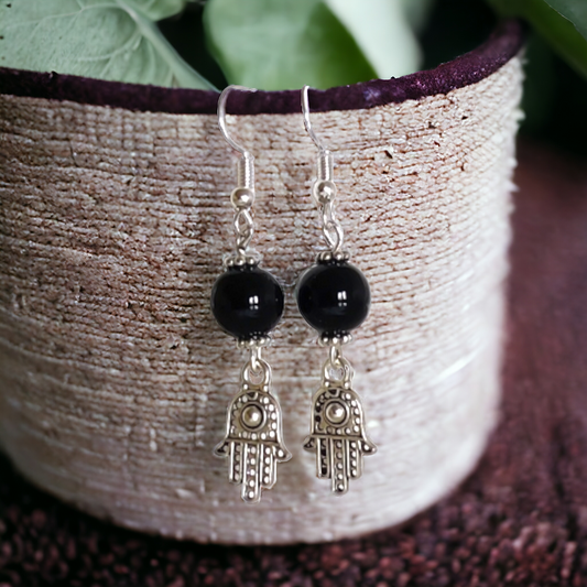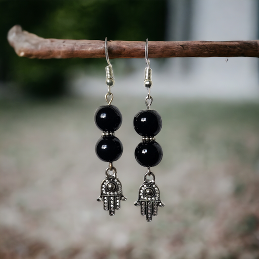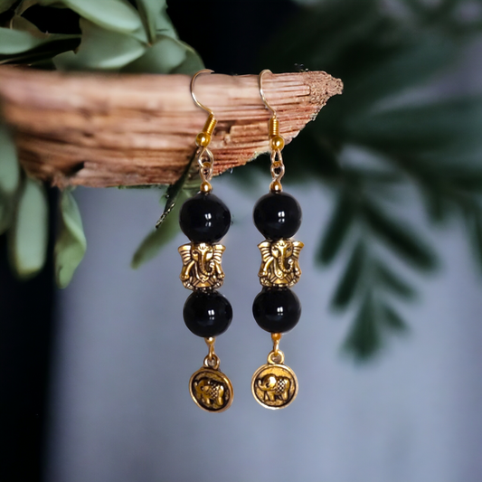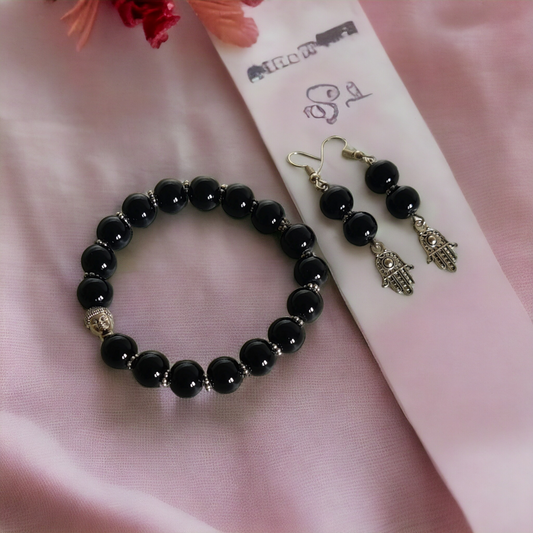 Black Glass Beads Bracelet & Earrings Set With Cute Metal Charms