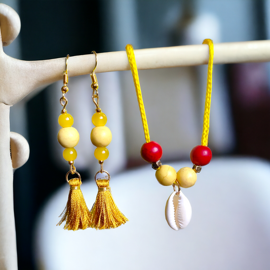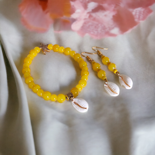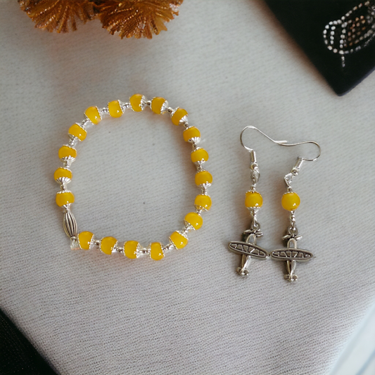 Yellow Glass Beads Bracelet & Earrings Set Adorned With Cute Metal Charms