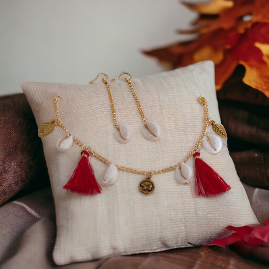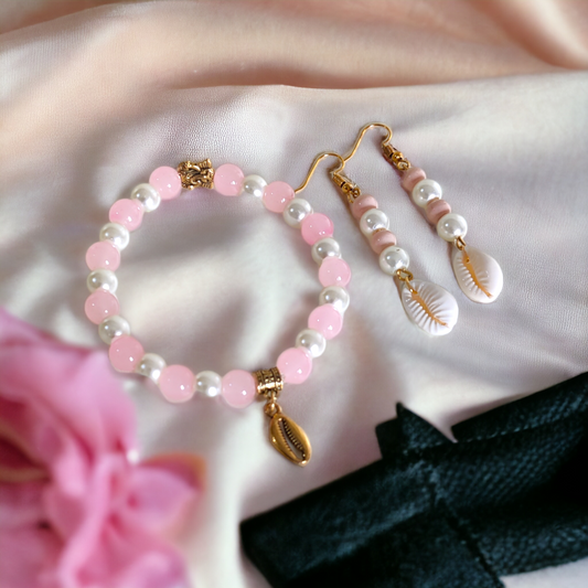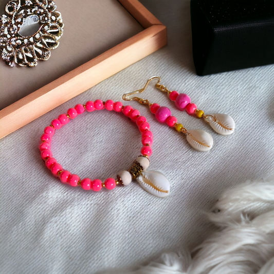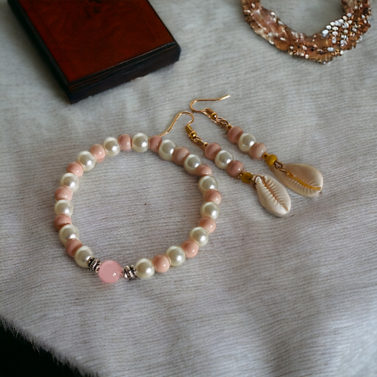 Pink Beads, Pearls With Cowrie Bracelet & Earrings Set