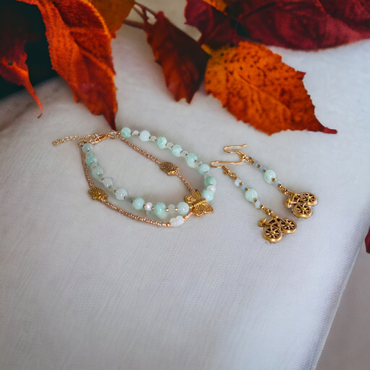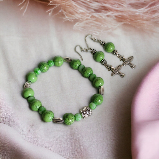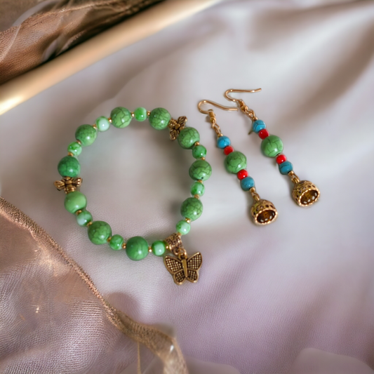 Green Clay Beads Bracelet & Earrings Set With Cute Metal Charms
