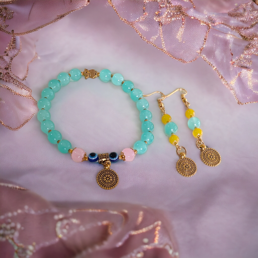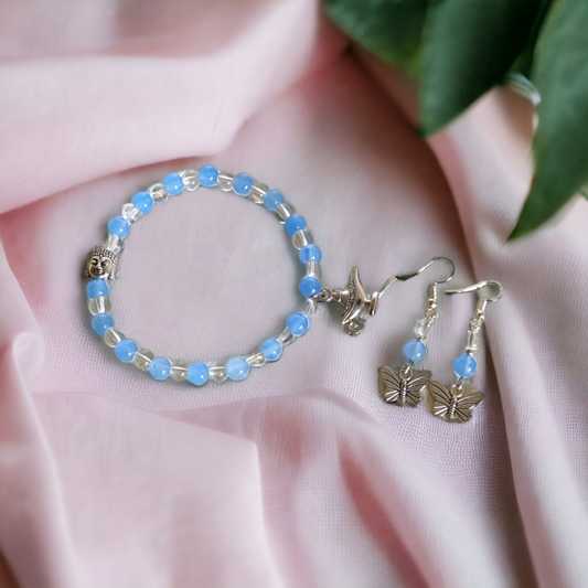 Blue Glass Beads Bracelet & Earrings Set Adorned With Cute Metal Charms