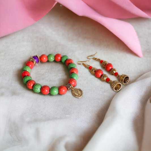 Green & Orange Clay Beads Bracelet & Earrings Set