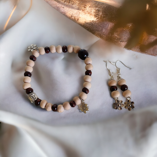 Wooden Beads Bracelet & Earrings Set Adorned With Cute Metal Charms